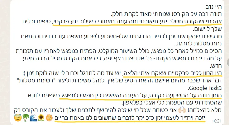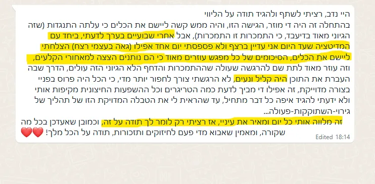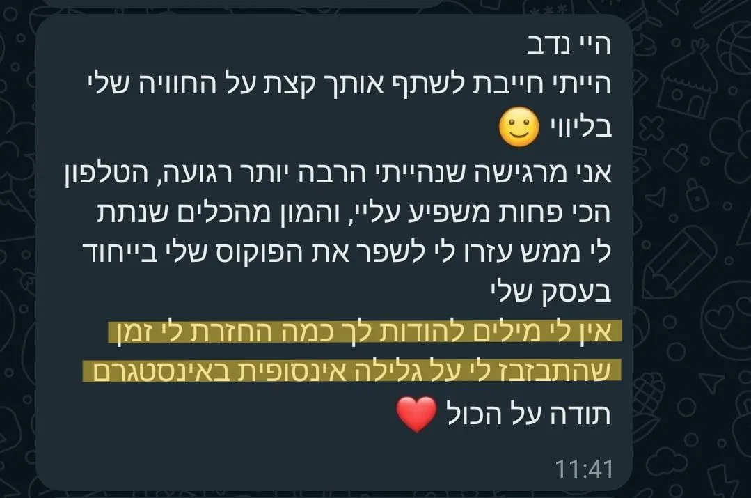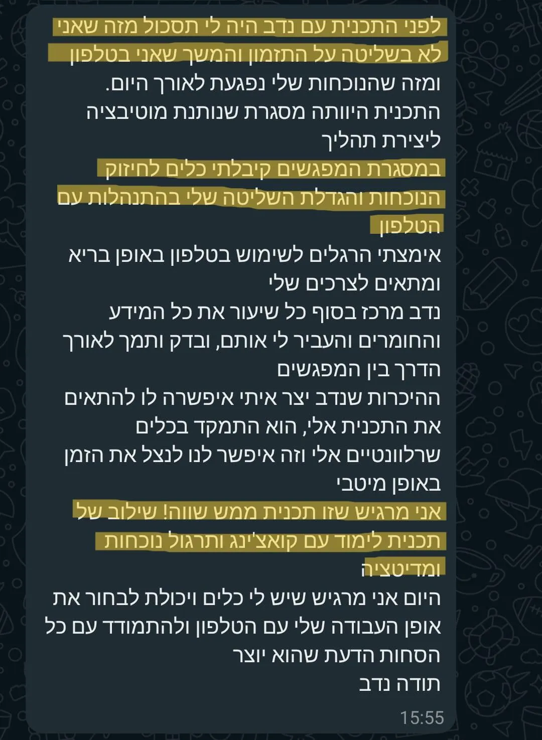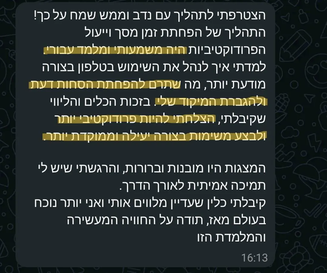 "בזכות הכלים והלווי ,למדתי איך לנהל את השימוש בטלפון שלי בצורה מודעת יותר. מה זתרם להפחתת הסחות דעת ולהגברת המיקוד. הצלחתי להיות פרודקטיבי יותר ולבצע את המשימות שלי ביעילות".