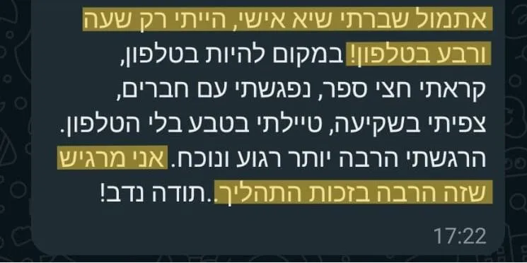 היום אני מרגיש שיש לי כלים לבחור את אופן העבודה שלי עם הטלפון ולהתמודד עם כל ההסחות שהוא יוצר